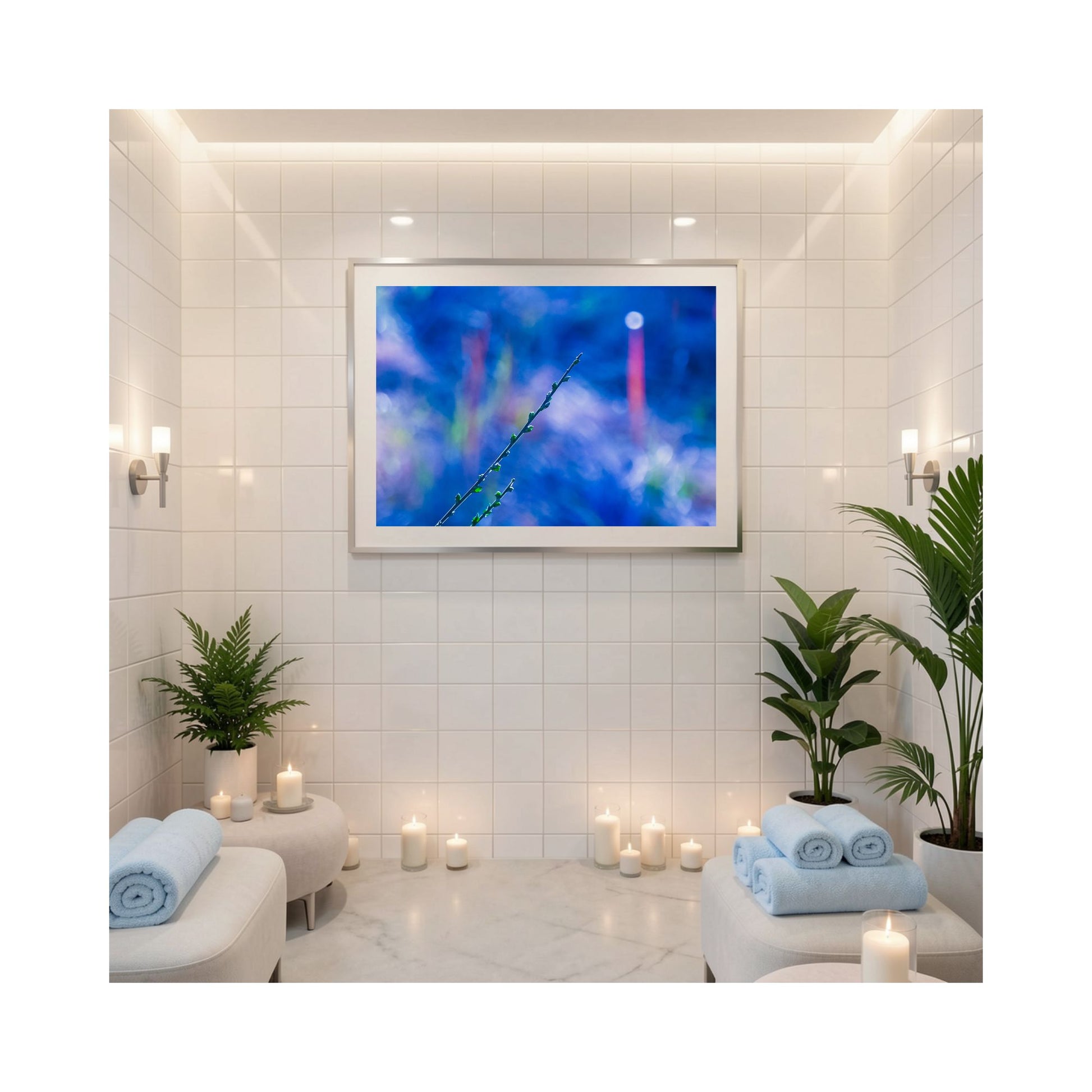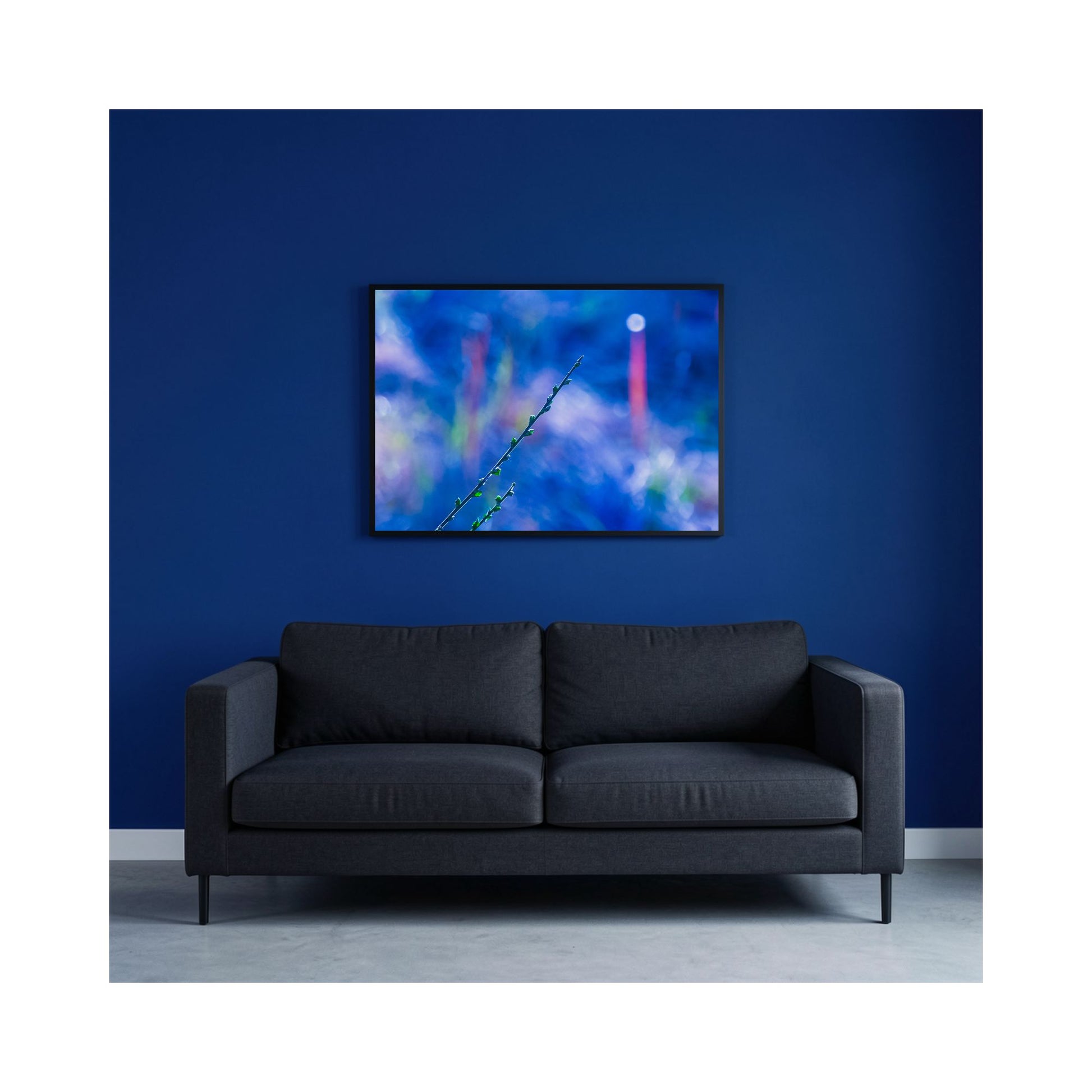 Towards The Light - a tranquil study of movement, color, and quiet growth. A single botanical stem rises diagonally through a soft field of luminous blues and violets, creating an image that feels both grounded and ethereal. Gentle bokeh and painterly gradients form an abstract backdrop, allowing the eye to rest on the delicate silhouette as it reaches toward a distant glow.